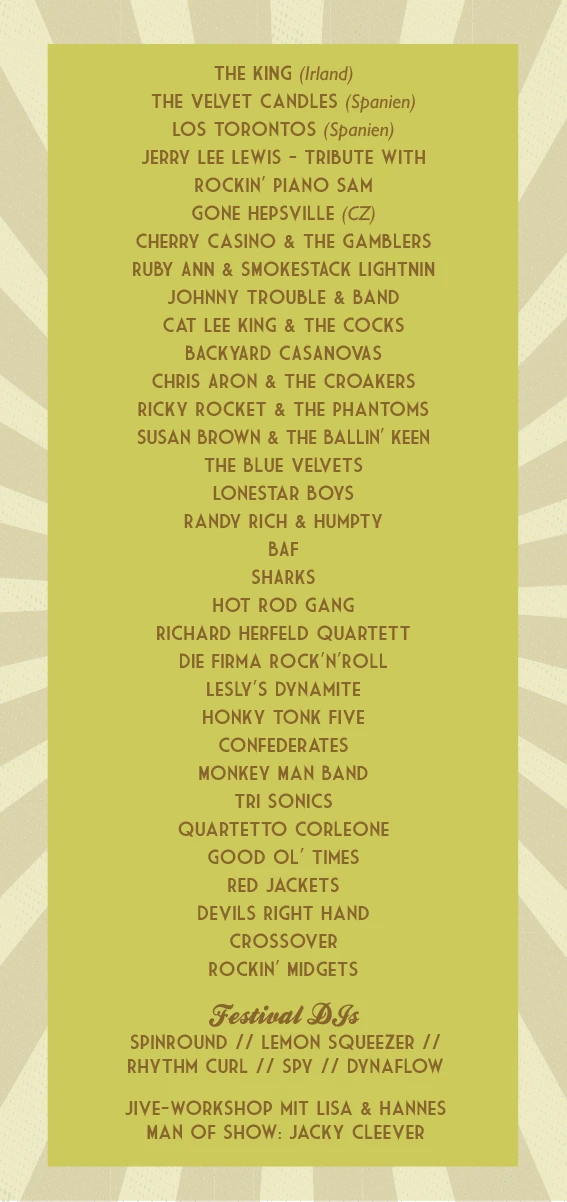 Founded 2018 in Bonn-Germany, the Backyard Casanovas are no greenhorns to the 50s Rhythm’n’Blues scene. Known as „the Cocks“ of “Cat Lee King and his Cocks”, they noticed that whenever Tommy J. Croole hits the stage for the song „Smokestack Lightnin“ the audience has a demand for more. So Tommy J. Croole, Sidney Ramone, Lucky Luciano and Rene Lieutenant decided to practice more songs and get on stage as the Backyard Casanovas. Their reportoire is a mix of their own songs and well- and less-known songs of their idols Hound Dog Taylor & Hasil Adkins. So if you like both of them or none you have to witness this band live on stage.